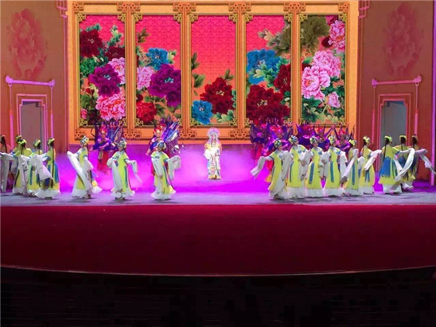舞臺上,盛放的牡丹嬌艷奪目,象征不同劇種、不同流派競相發(fā)展、相映生輝;金色的宮燈端莊大氣,寓意中華戲曲事業(yè)薪火相傳、發(fā)揚光大。