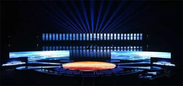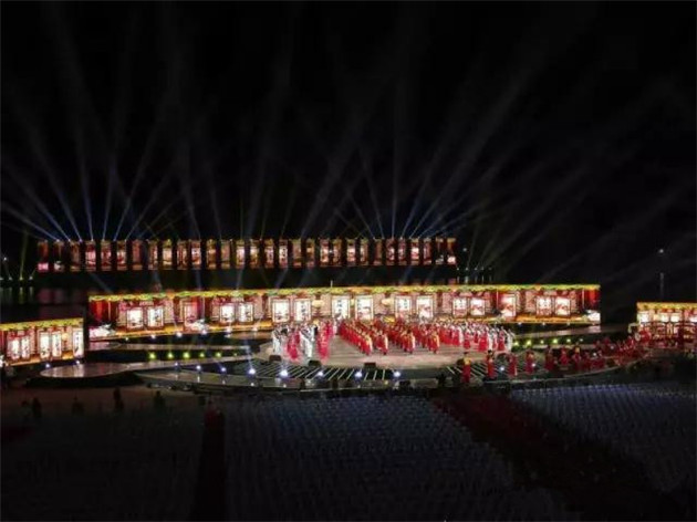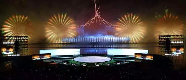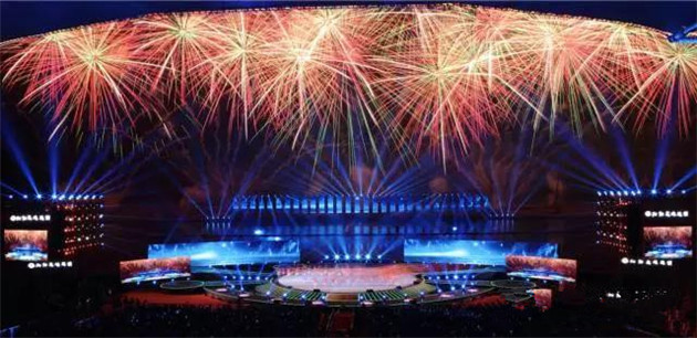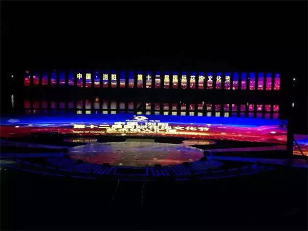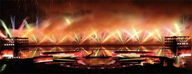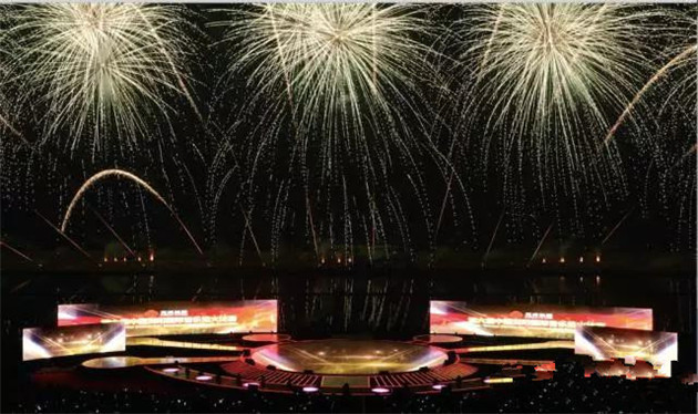 晚會現(xiàn)場,2000平方米的全景巨屏 屹立瀏陽河畔,整個舞臺三面環(huán)水,在夜空下格外恢宏壯觀。屏幕背后便是神秘的焰火燃放地,待焰火表演時巨型屏幕開啟,上演了中國首場 全景巨幕藝術焰火表演。通過立體錯位技術與焰火造型創(chuàng)意,屏幕上的畫面被焰火延伸至河面、至天空,漫天煙花雨,實現(xiàn)超視距的視覺震撼和音詩畫焰火聲光色的完美融合。
